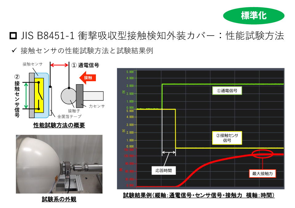 YaWaRaKaロボD(衝撃吸収型接触検知外装カバー)に代表されるような衝撃吸収性と接触検知機能を一体化した外装カバー部品について、その性能を客観的かつ定量的に評価するための試験方法として、日本産業規格 JIS B8451-1 が制定されました。